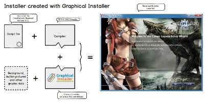 All you need is to update your script with appropriate calls to Graphical Installer API, create graphic data (background picture, buttons, ...) and compile everything together. Such installer with custom design we call Graphical Installer powered installer. See the compilation process for Graphical Installer powered installer in the picture to the left.